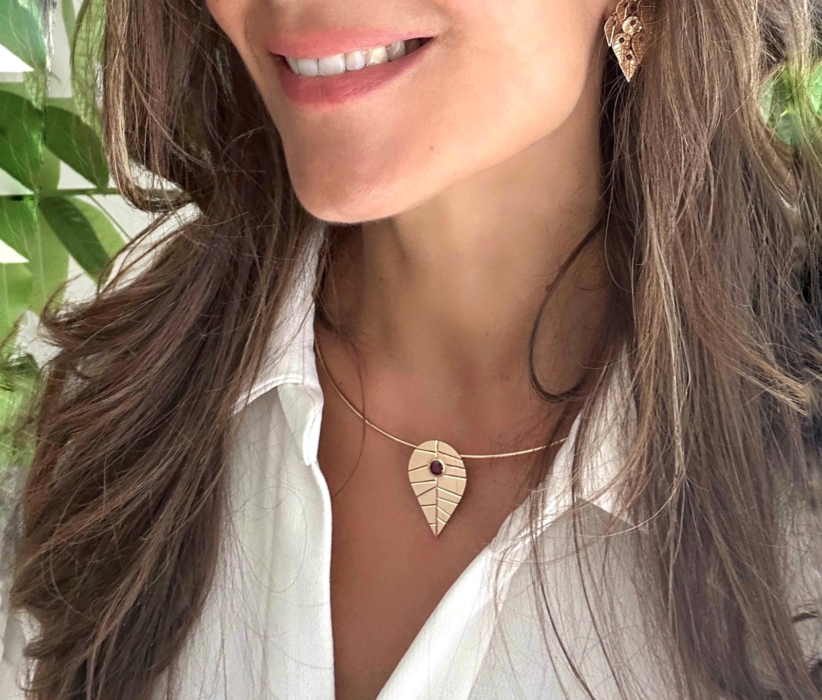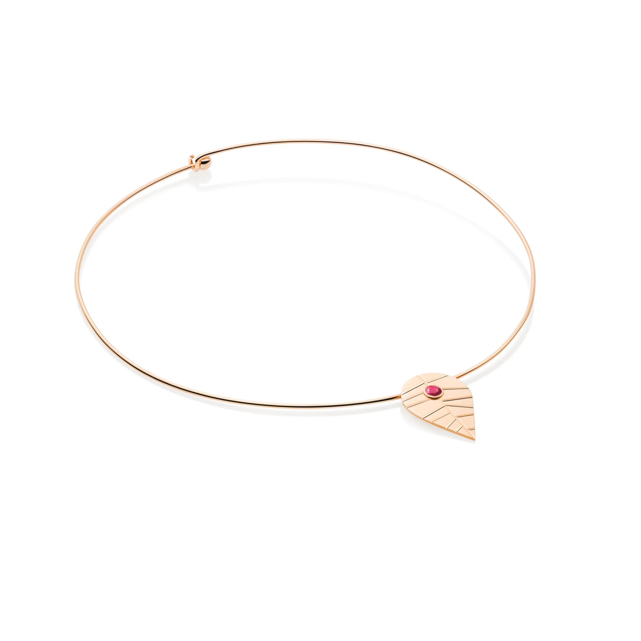 A graceful 18K gold necklace, where the simple elegance of a single engraved leaf, set with a natural ruby, captures the quiet grace and refined beauty of nature.