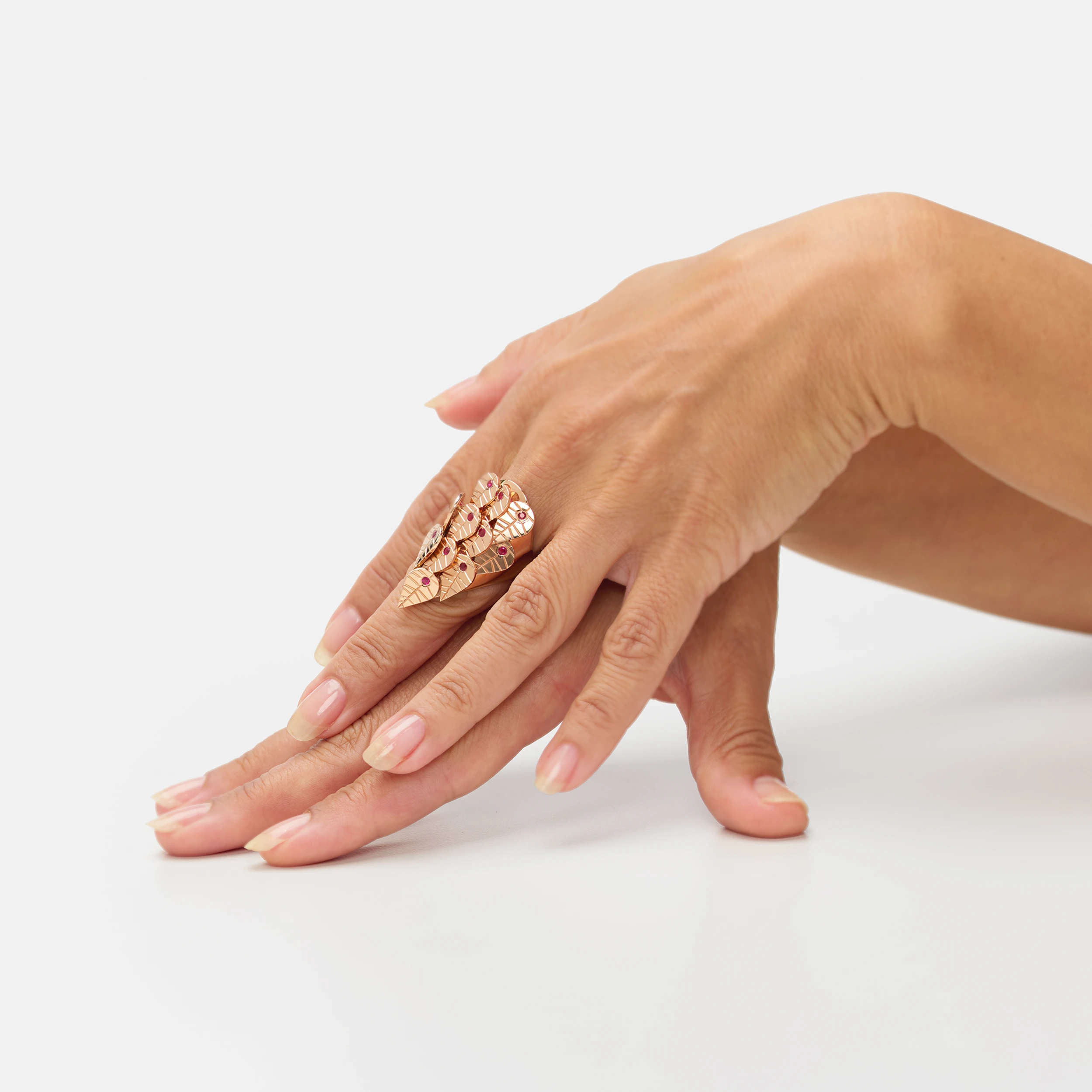 Each ring is set with carefully selected fine gemstones, enriching its natural elegance and timeless allure. Every leaf is delicately engraved with stylised vein patterns, adding depth and artistic refinement to the design. A harmonious composition of craftsmanship, precious materials, and graceful movement—true to the spirit of Maceira Jewels.